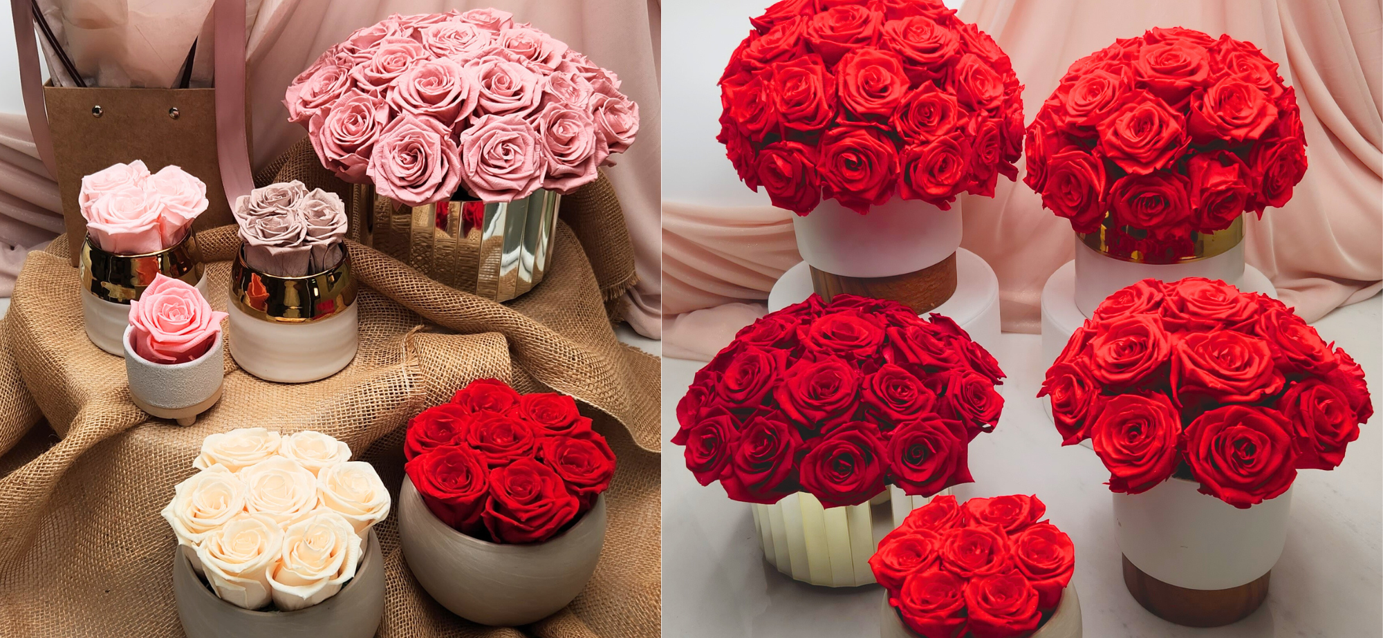 Our roses are 100% natural fresh roses that have gone through a preservation process to maintain their beauty and freshness without the need for water or light for up to one year.